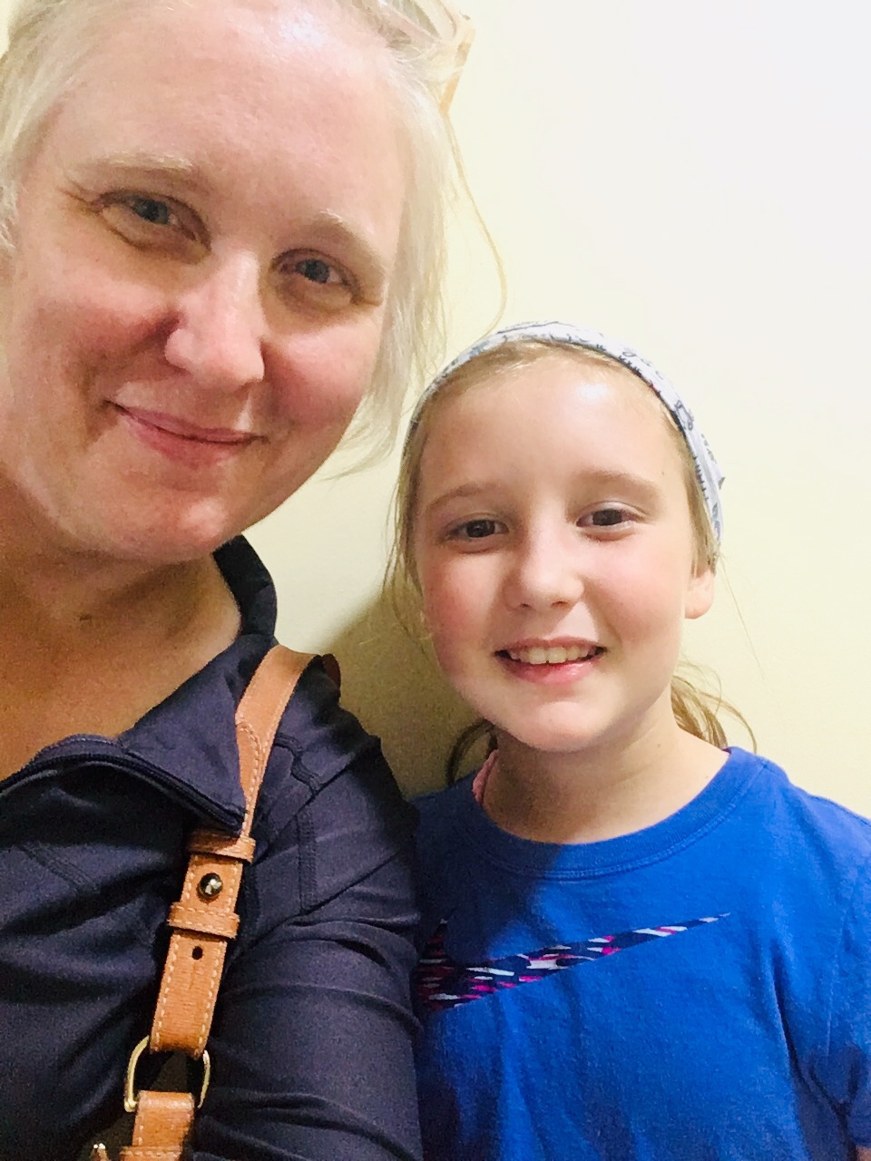 Here’s Ellie and I waiting on the others to buy us doughnuts and macchiatos before church on Sunday.